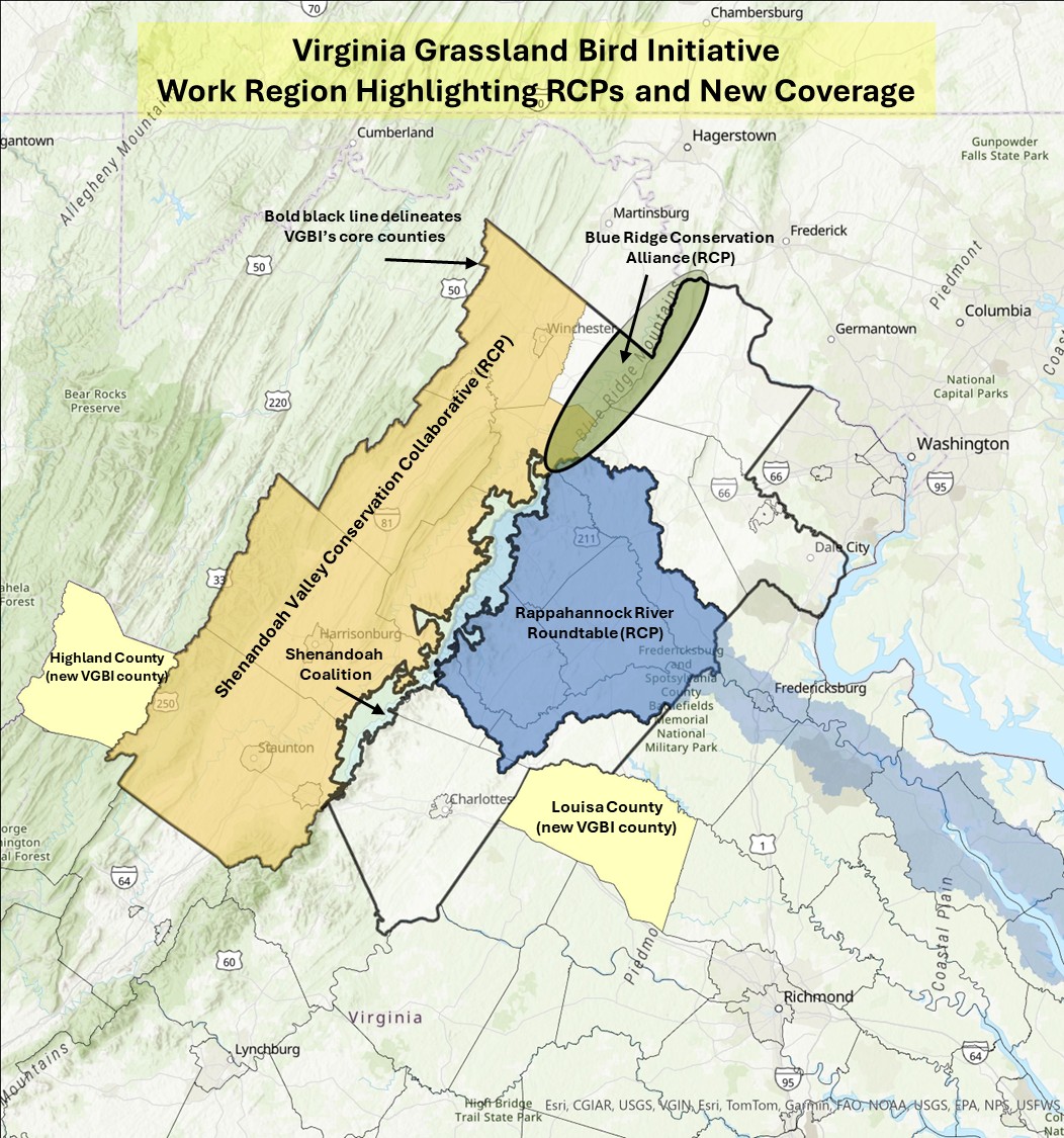 VWL’s grassland bird research and collaboration with PEC has sparked a partnership with the American Bird Conservancy, which has led to the designation of VBGI’s 16-county region into a formally recognized conservation zone, or BirdScape. The aptly named Northern Virginia Piedmont and Shenandoah Valley BirdScape defines a focal area for partners to conserve declining bird populations and opens doors to building new and innovative collaborations for overcoming the challenges these birds face.